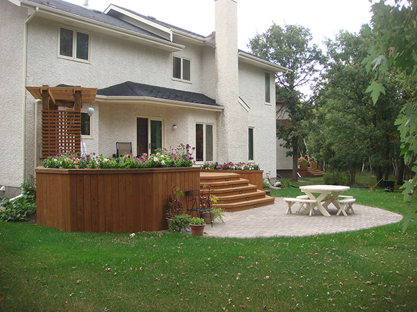 Backyard oasis with bridge, dry stream, dry waterfall, shed patio and deck