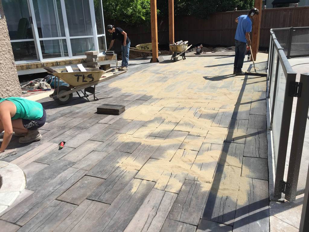 Bridgewood slab patio in cedar brown with Trex composite stairs and treated brown gazebo roof