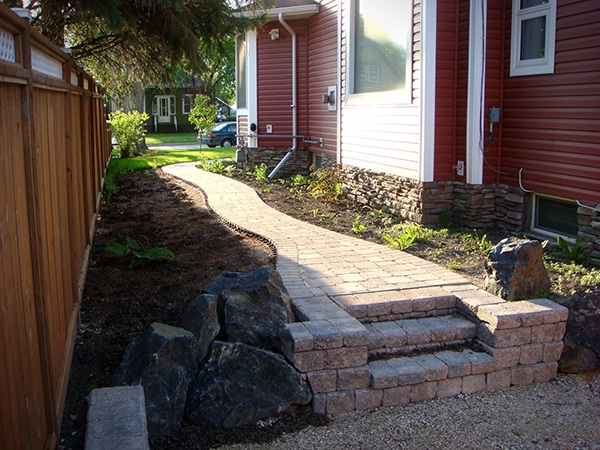 Complete yard renovation. Roman paving stones and retaining walls. Plantings and boulders surrounded by red wood mulch. Treated brown fence with white lattice top (Retaining Walls)