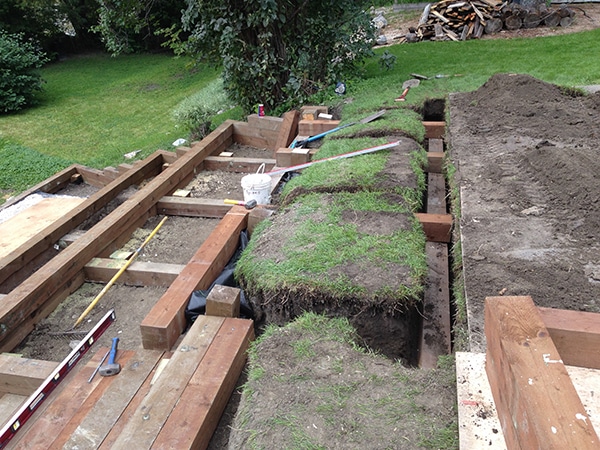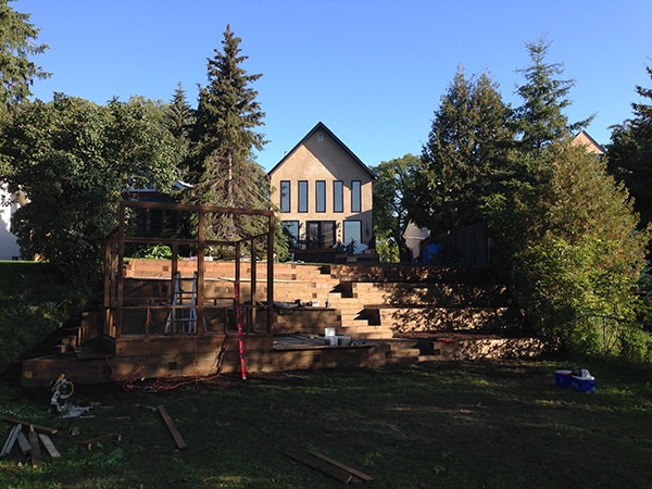Treated brown retaining wall with built-in gazebo on bank of Assiniboine river